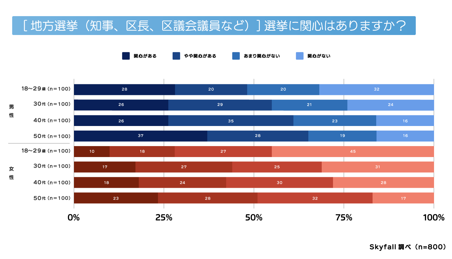 50代男性の関心層(「関心がある」「やや関心がある」の合計)が65.0%と高い水準を保つ一方、18~29歳女性では28.0%に留まります。国政だけでなく、より身近な地方の政治においても、年代と性別による関心の二極化という構造がうかがえます。