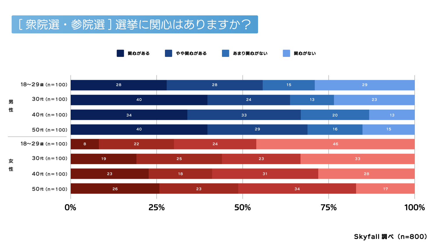 一方で、若年層に目を向けると、また少し違った傾向が見えてきます。特に18~29歳女性では、「関心がある」「やや関心がある」の合計はわずか30.0%にとどまりました。逆に「関心がない」と回答した割合が46.0%と半数近くを占めており、他の層と比較しても明らかに政治への関心の低い様子ががうかがえます。