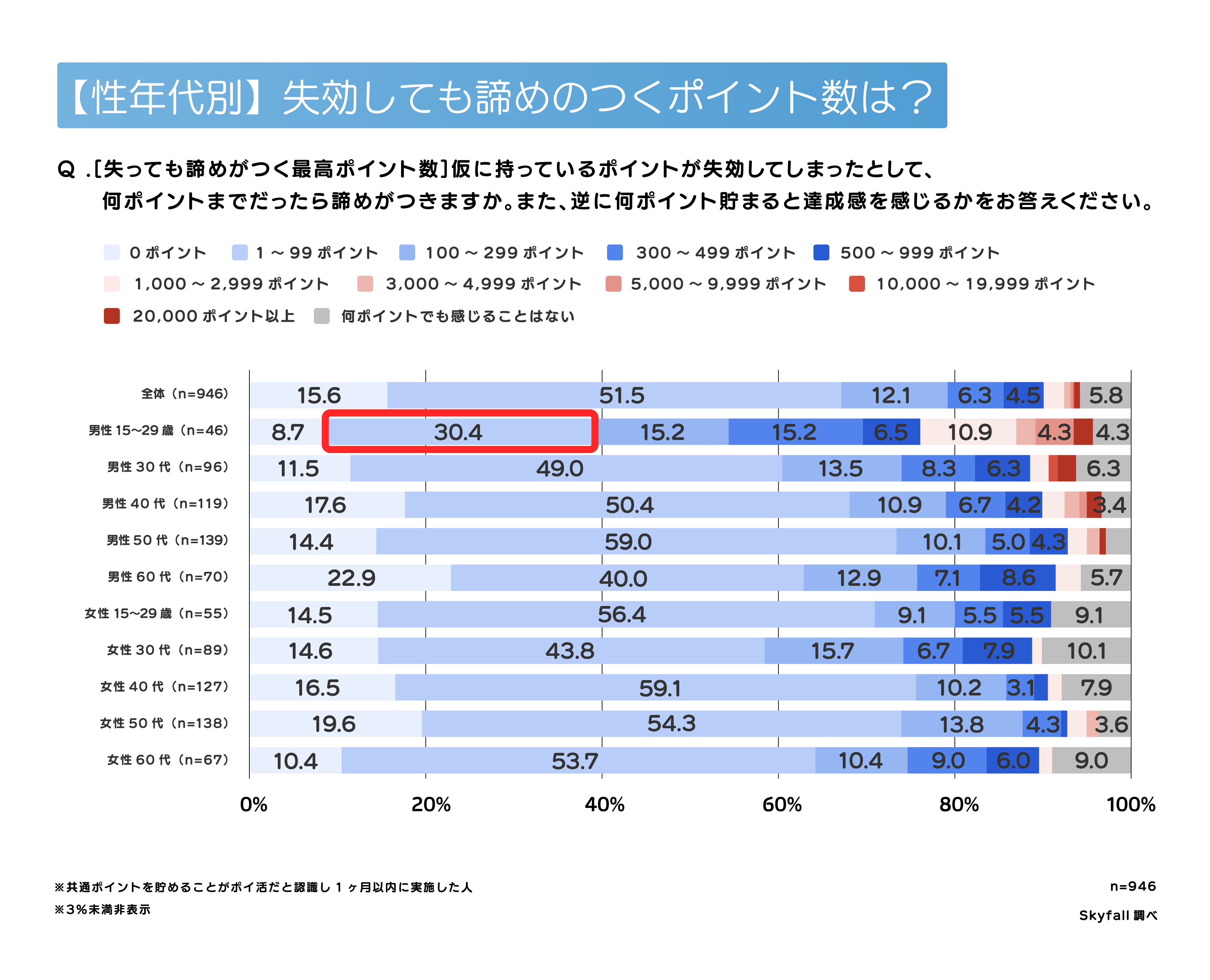 性年代別でみると、男性15〜29歳は「1~99ポイント」が30.4%で全体に比べると大きく低下し、“100ポイント以上”で割合が増加。中でも「300〜499ポイント」「500〜999ポイント」で上昇し、他の年代に比べて“諦めがつくポイント”の心理的ラインは高めです。また女性の多くは「1〜99ポイント」が中心となり、ポイントの少額失効に対して感度が高いことがうかがえます。
