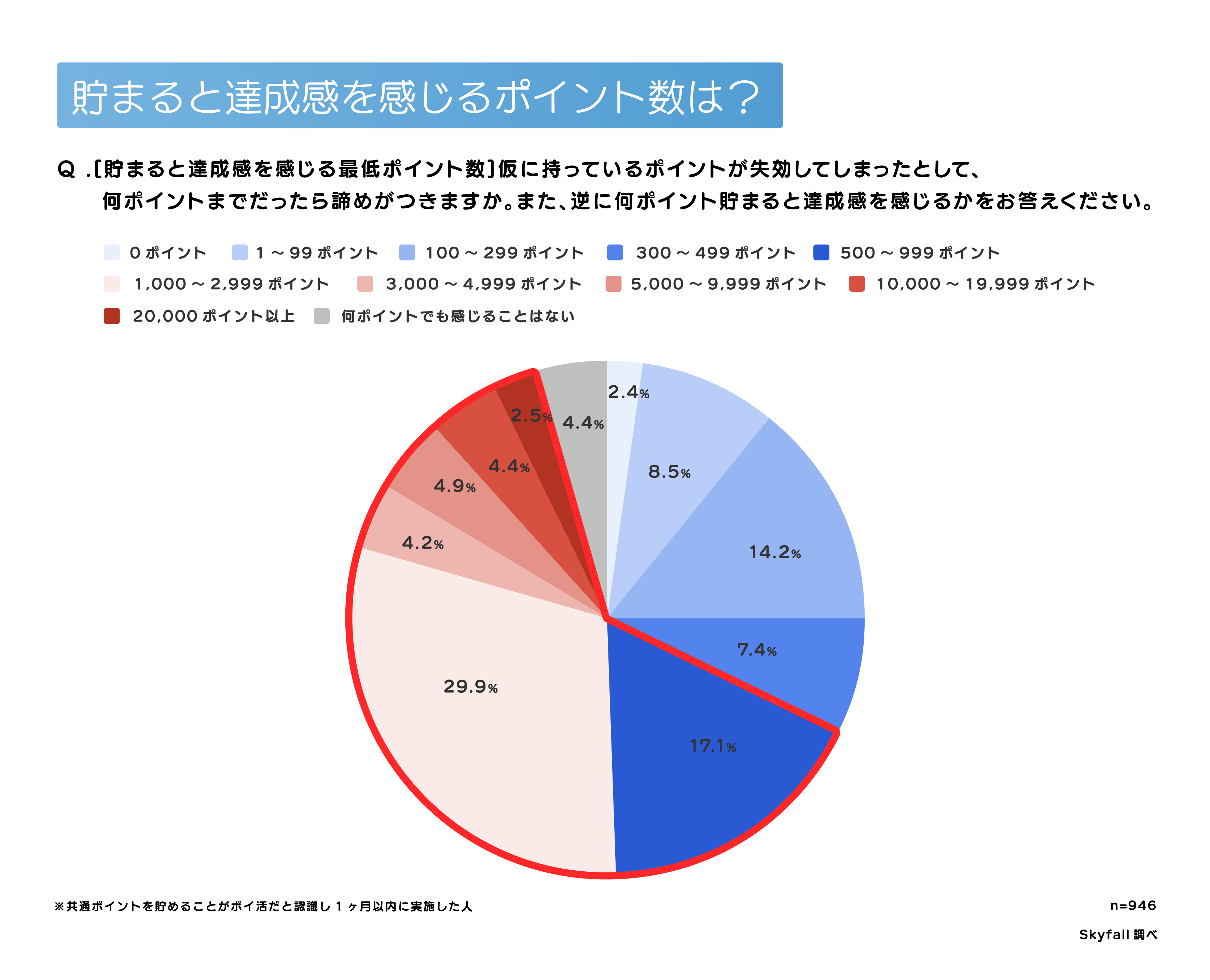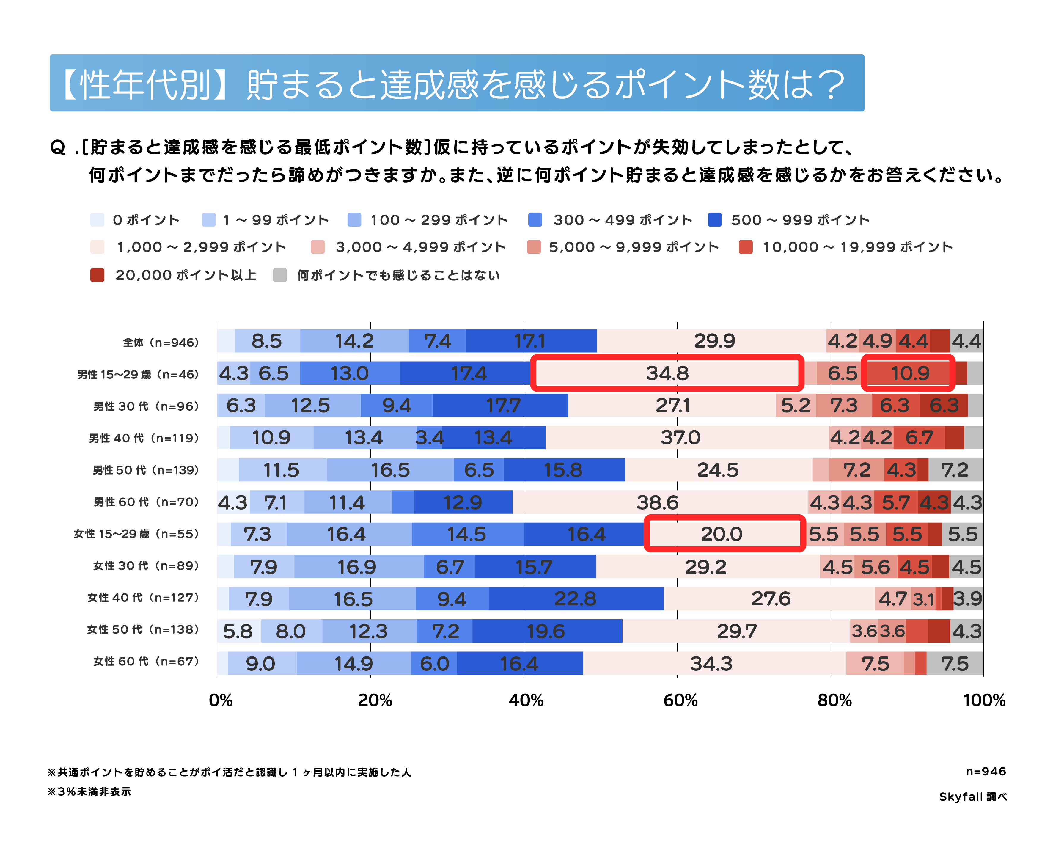 こちらは失効ポイントより高い心理的ラインが設定されており、最も多いのは「1,000〜2,999ポイント」が29.9%。次いで「500〜999ポイント」が17.1%で、“500ポイント以上”は6割強となりました。